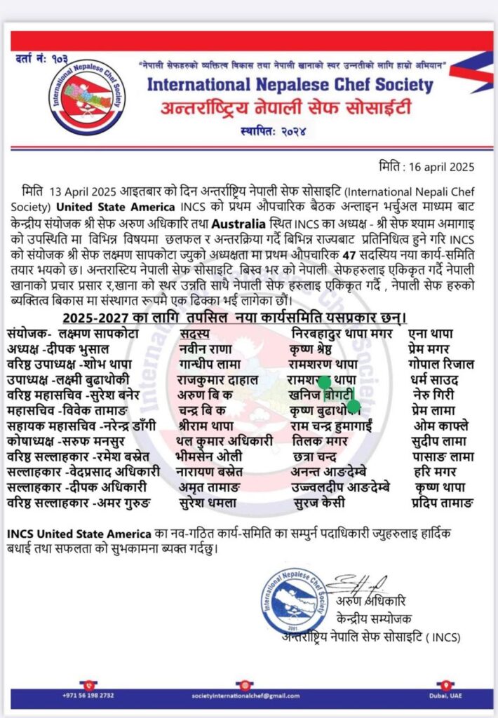 १३ अप्रिल २०२५ आइतबार, अन्तर्राष्ट्रिय नेपाली सेफ सोसाइटी (International Nepali Chef Society – INCS), संयुक्त राज्य अमेरिकाको प्रथम औपचारिक बैठक भर्चुअल माध्यमबाट सफलतापूर्वक सम्पन्न भएको छ। बैठकमा अमेरिका भरिका विभिन्न राज्यहरूबाट नेपाली सेफहरूको सक्रिय सहभागिता देखिएको थियो।