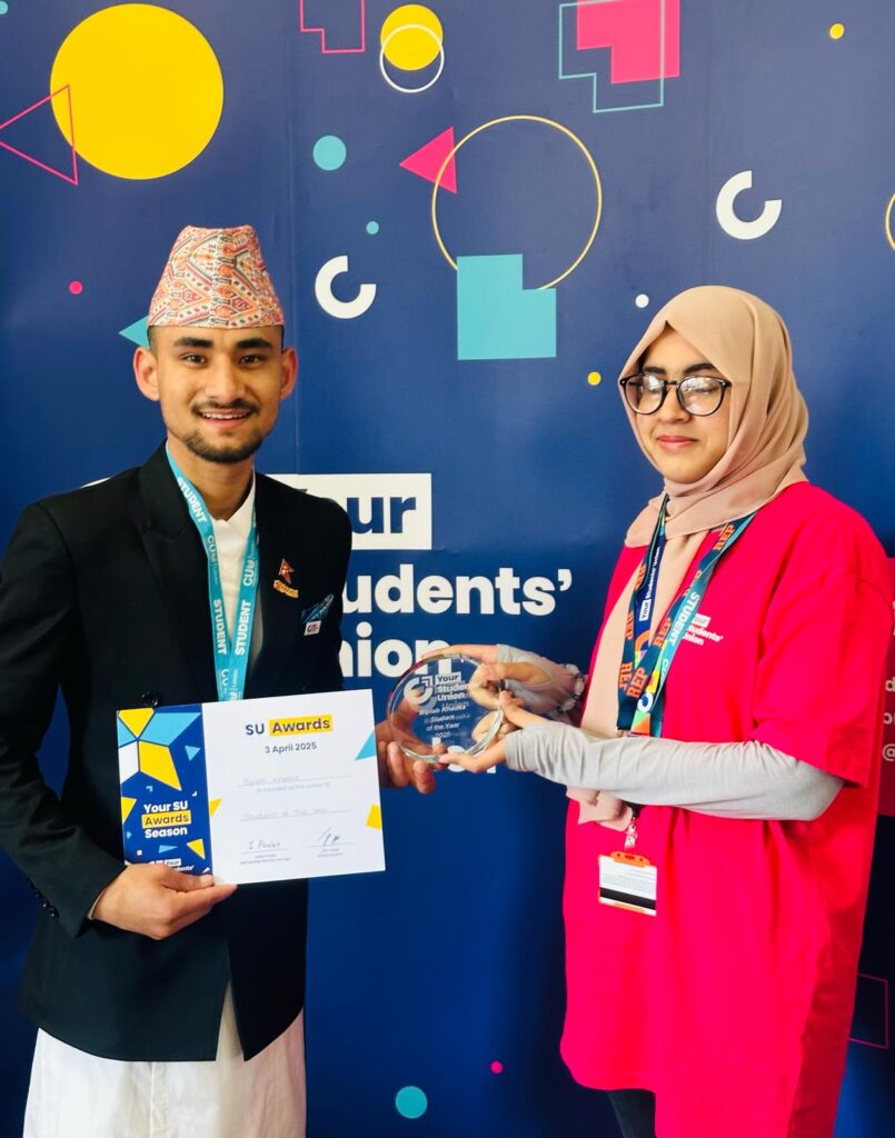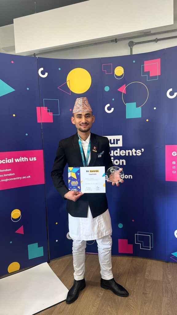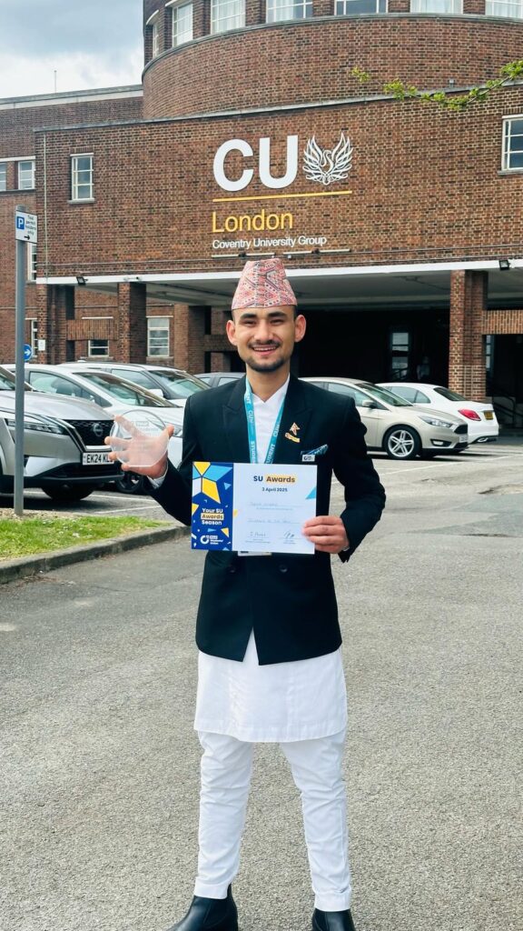बेलायत – नेपाली सामाजिक अभियन्ता तथा युवाका लागि प्रेरणादायी व्यक्तित्वका रूपमा परिचित विप्लव खड्का हाल बेलायतको प्रतिष्ठित कोभेन्ट्री विश्वविद्यालयमा उच्च शिक्षा अध्ययनरत छन्। शैक्षिक यात्रासँगै समाजमा सकारात्मक परिवर्तन ल्याउने उद्देश्यले सक्रिय खड्काले अनुशासन, नेतृत्व क्षमता, शैक्षिक उत्कृष्टता तथा सामाजिक सेवामा पुर्याएको योगदानका आधारमा सन् २०२४–२५ को ‘स्टुडेन्ट अफ दि इयर’ (Student of the Year) उपाधि प्राप्त गर्न सफल भएका छन्।