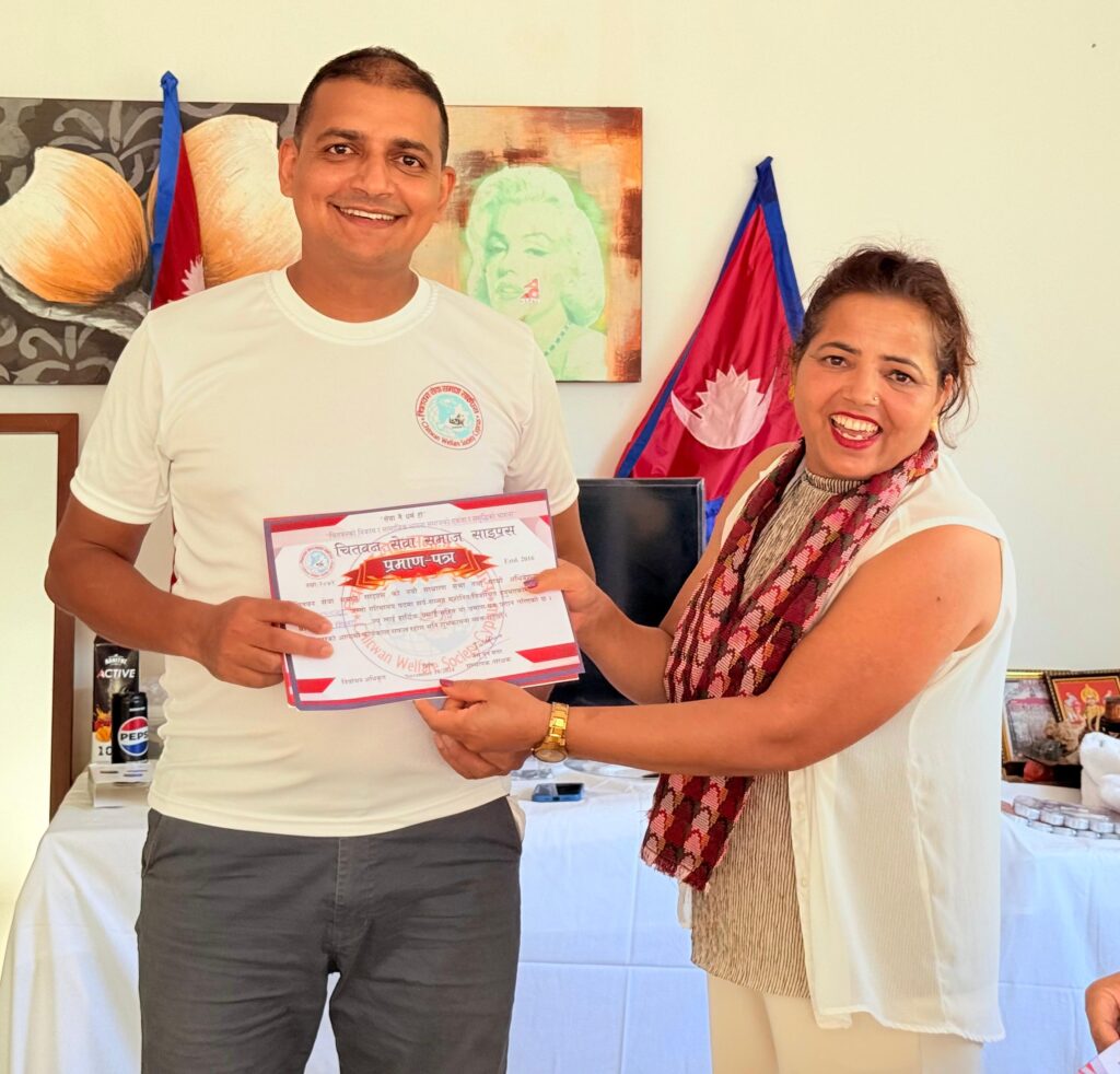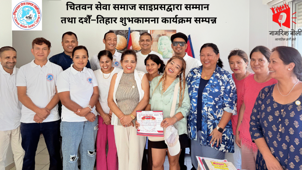 चितवन सेवा समाज साइप्रसले आज एक विशेष कार्यक्रम आयोजना गरी संस्थाका सक्रिय सदस्यहरुलाई सम्मानित गरेको छ। कार्यक्रममा सदस्यता प्रमाणपत्र तथा “प्रशंसा–पत्र” प्रदान गरियो। पदाधिकारीहरुलाई समाजप्रतिको योगदान र समुदायमा पुर्याएको सकारात्मक प्रभावका लागि सम्मान गरिएको हो।
