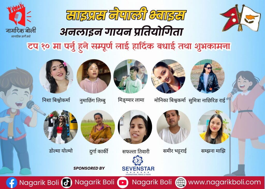 साइप्रस। साइप्रसमा रहेका नेपाली समुदायको पहिचान, भाषा र कलालाई प्रवर्द्धन गर्ने उद्देश्यले ‘नागरिक बोलि’ द्वारा आयोजित पहिलो पटकको अनलाइन गायन प्रतियोगिता ‘साइप्रस नेपाली भ्वाइस’ को पहिलो चरण सम्पन्न भएको छ। प्रतियोगितामा सहभागी ३० जना प्रतियोगीहरूमध्ये उत्कृष्ट १० जना (Top 10) लाई दोस्रो चरणका लागि छनौट गरिएको छ।