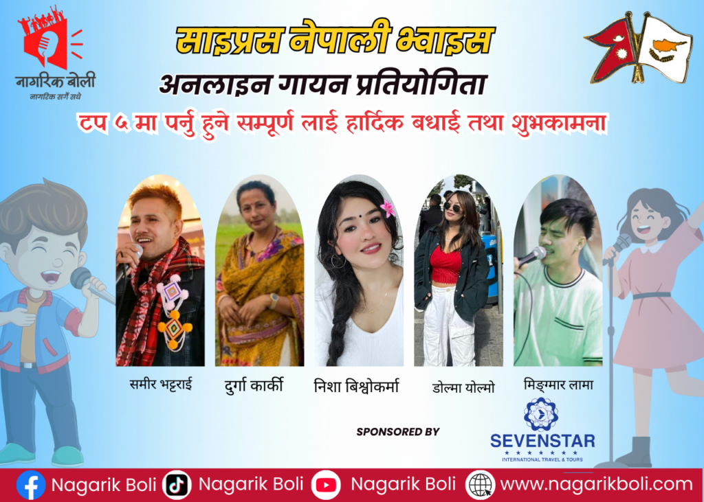 लिमासोल, साइप्रस। ‘नागरिक बोली अनलाइन गायन प्रतियोगिता’ अब आफ्नो अन्तिम र निर्णायक चरणमा प्रवेश गरेको छ । डिजिटल प्रतिस्पर्धाबाट उत्कृष्ट ५ मा पर्न सफल भएका समीर भट्टराई, दुर्गा कार्की, निशा विश्वकर्मा, डोल्मा योल्मो र मिङ्मार दोर्जे लामाबीच अब उपाधिका लागि अन्तिम प्रतिस्पर्धा हुनेछ ।